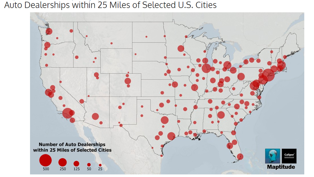 Figure 2 shows the density of auto dealerships around large and mid-sized cities in the US. In addition, many smaller cities and towns also have auto dealers.